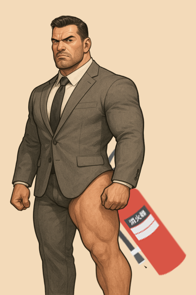 プロンプト おしりに消火器が刺さった屈強な男。服はスーツで!↓